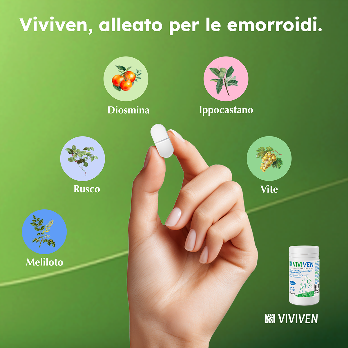 Viviven è un integratore alimentare a base del flavonoide Diosmina, Vite titolata in proantocianidine, Ippocastano titolato in escina, Rusco e Meliloto 1.