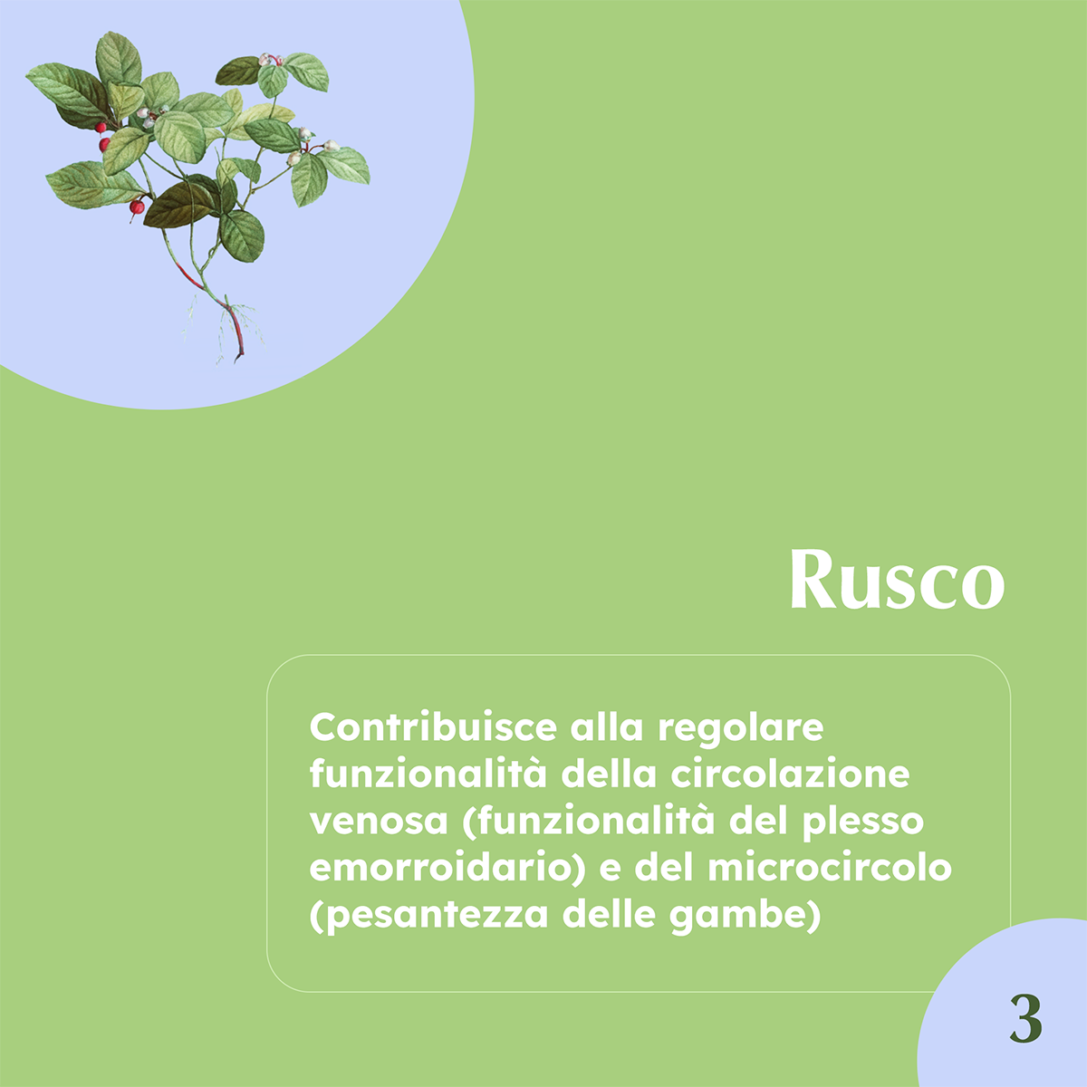L’estratto di Rusco contribuisce alla regolare funzionalità del microcircolo (pesantezza delle gambe) e della circolazione venosa (funzionalità plesso emorroidario)