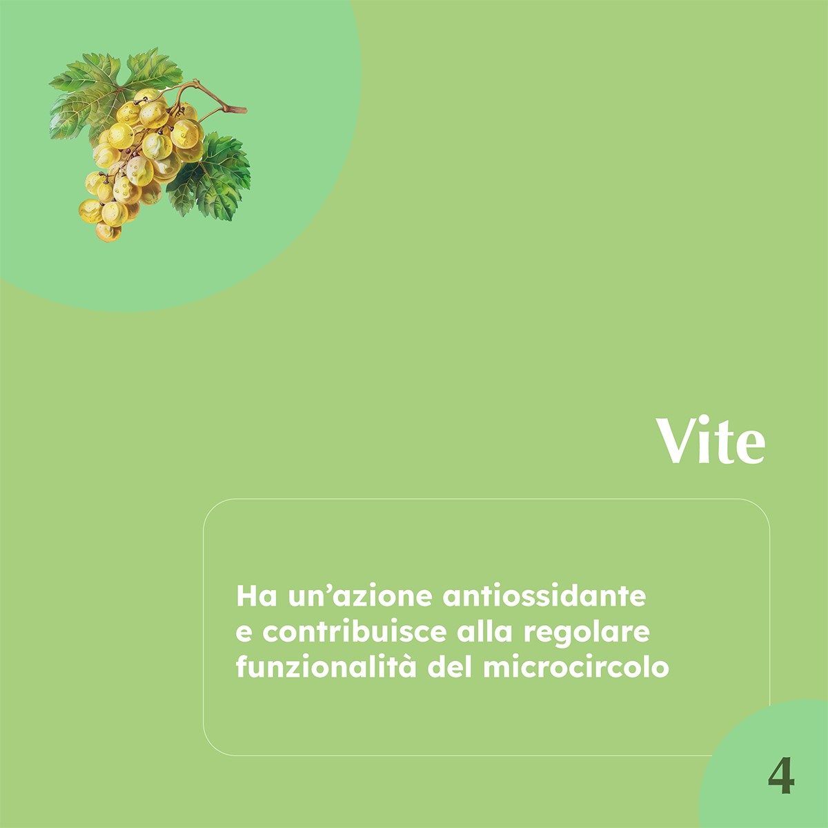 L’estratto di Vite contribuisce alla regolare funzionalità dell’apparato cardiovascolare e del microcircolo (pesantezza delle gambe) e ha azione antiossidante.